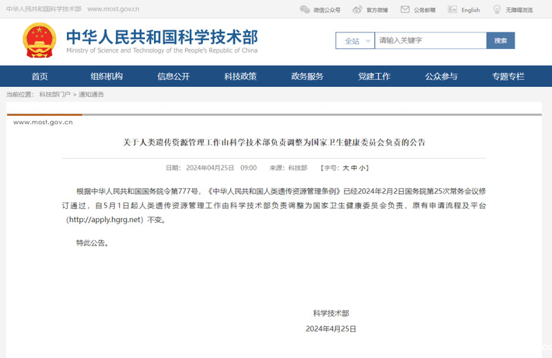 根据中华人民共和国国务院令第777号,《中华人民共和国人类遗传资源管理条例》已经2024年2月2日国务院第25次常务会议修订通过,自5月1日起人类遗传资源管理工作由科学技术部负责调整为国家卫生健康委员会负责,原有申请流程及平台(http://apply.hgrg.net)不变。