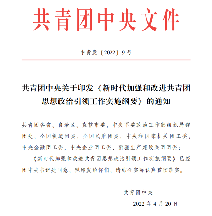 共青团中央关于印发 《新时代加强和改进共青团思想政治引领工作实施纲要》 的通知