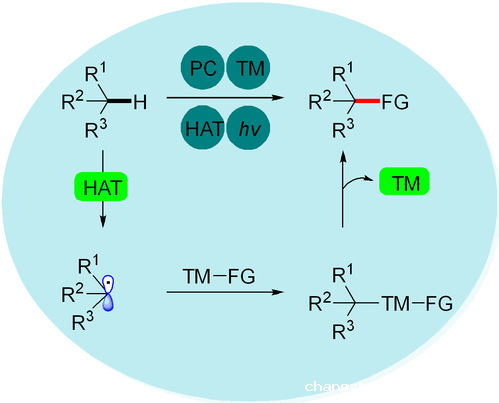 论文中,作者总结了可见光介导双催化体系(光催化剂+过渡金属催化剂)下sp3碳氢键不同功能化(芳基化、烷基化、脱氢化、叠氮化等)相关研究成果,详细阐述了光催化剂与过渡金属催化相互作用时的主要机理,首次提出了不同过渡金属催化之间的相似性与差异性,为其在药物合成和材料科学应用领域的发展提供诸多可行的思路。
