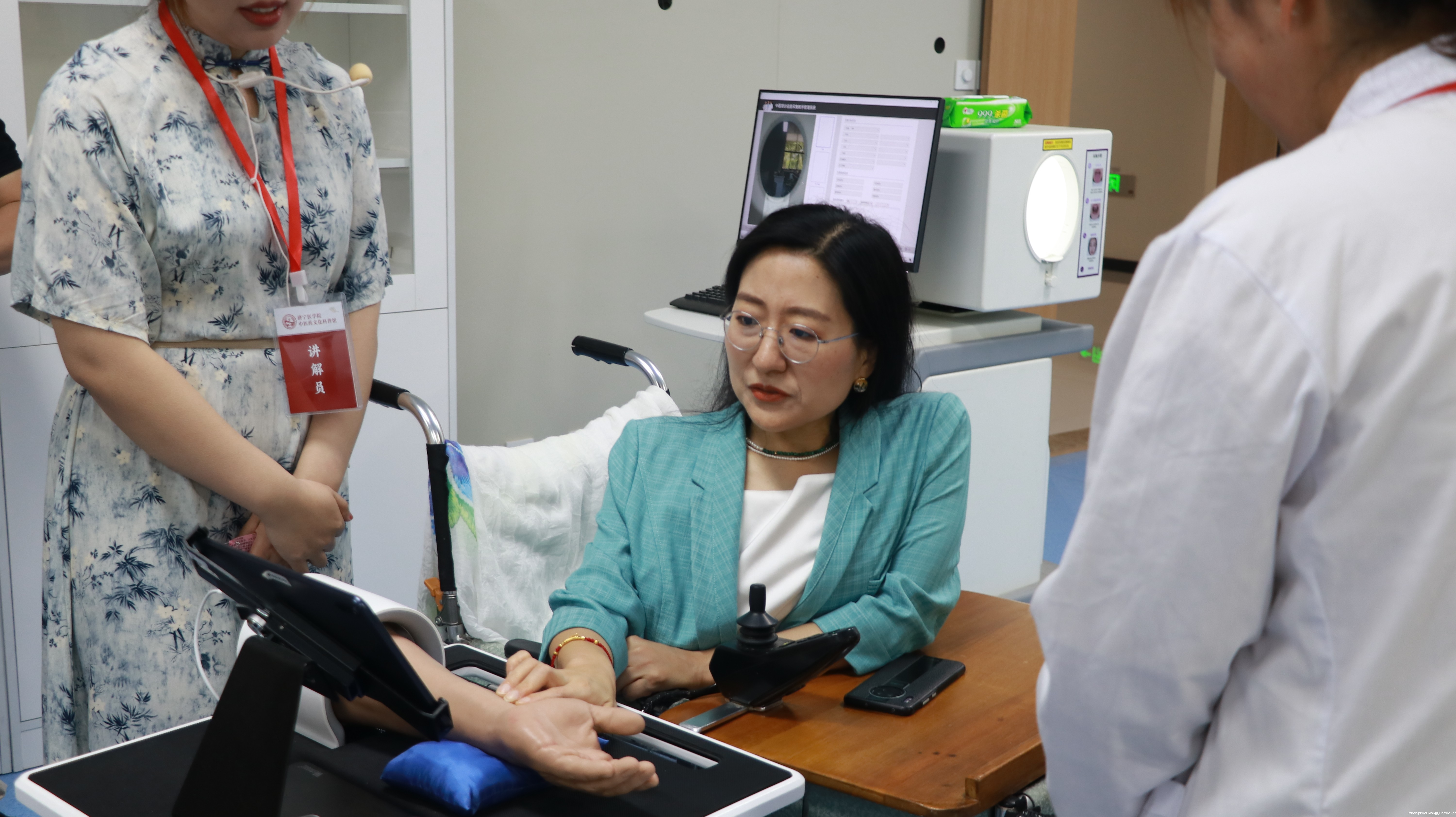 中医药科普教育基地的艾珊珊老师为张晓清详细介绍了中医药的历史、理论和实践。她认真聆听,不时提问,表达出了对中医药文化的肯定与赞美。刘晓清还亲自参观体验了一些中医的疗法和保健方法,如脉诊、艾灸、推拿等。她对这些疗法产生了浓厚的兴趣,表示希望将中医药文化分享给更多的人。